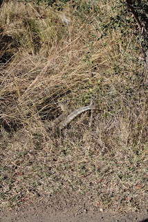 John started by letting us – Ketsia and me (Azadeh suddenly disappeared ;) - handle a Brown House Snake. Following that, we enjoyed playing with a Chameleon, before getting to the highlight of the day: Handling a Python, the largest African snake. The snake was very heavy, and its skin was surprisingly soft. When we were done playing with the Python, we moved on to see the following snakes as well: Black Mamba, Green Mamba, Boomslang, Puff Adder, Gaboon Adder, Black Necked Spitting Cobra, Mozambique Spitting Cobra, and Forest Cobra. John tried to feed a small chick to the Gaboon Adders, but all three of them passed on the meal, and had mercy on the little creature – at least at the time. In a separate part of the park, we also saw two other, less known but still poisonous snakes (sorry, I didn’t note down the names). Given that the Adders did not seem to be hungry, and John was determined to show us a snake “in action” he aggravated one of the snakes with a stick, until it struck.